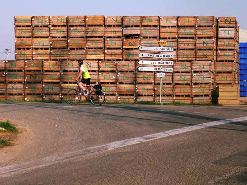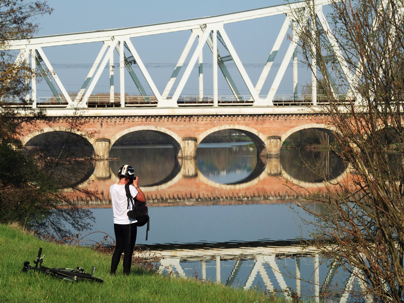 Départ de Toulouse, Canal du Midi, d’abord très urbain, puis de plus en plus campagnard. On roule tantôt à droite, tantôt à gauche, les écluses se suivent et se ressemblent un peu. Puis le Canal du Midi se transforme en Canal Latéral. Le vent nous est toujours favorable, mais l’air est chargé de pollen et de moucherons. On éternue. La sieste post pic-nique est maintenant devenue coutume. Qui veut aller loin ménage sa monture. Nous faisons étape à Montauban, Agen (Colayrac Saint Cirq), La Réole, pour atterir à Bordeaux.