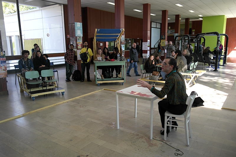 À la base nous disposons de mobilier de récupération issu du renouvellement de la faculté de science, voisine. Celui-ci nous sert de base pour dès le début tester des dispositions dans le hall. Puis au fur et à mesure des usages rencontrés et des envies exprimées nous dessinons puis construisons différents modules symbolisant ces possibles. Chaque module est constitué d’un ensemble de mobiliers de récupération cohérent, chaises, tables… offrant un certain type d’usages. Les mobiliers sont reliés et complétés par une ossature en bois formant un module d’environ un mètre par deux, déplaçable par une personne seule grâce à un astucieux système de roulettes. Chaque module, une fois construit, viens perturber et compléter le système d’usage du hall. Suscitant de nouvelles réactions, de nouvelles discussions, et de nouvelles créations. Sont ainsi apparus : un kiosque, des gradins, un bureau, une bibliothèque de troc, des transats. En parallèle, chaque midi en partenariat avec le TU (Théâtre Universitaire) et le FUN (Festival Universitaire de Nantes), les modules sont support à des performances de danse, de théâtre, et de musique. Ces performances prennent place dans le hall et sur le chemin reliant le TU au Tertre. Encore après notre départ les modules vont rester à disposition des étudiants, du TU et de quiconque en aura l’usage. Ils permettront peut être d’initier d’une réappropriation collective et partagée du hall. ….Préfigurer, tester, transmettre.
