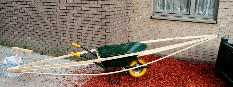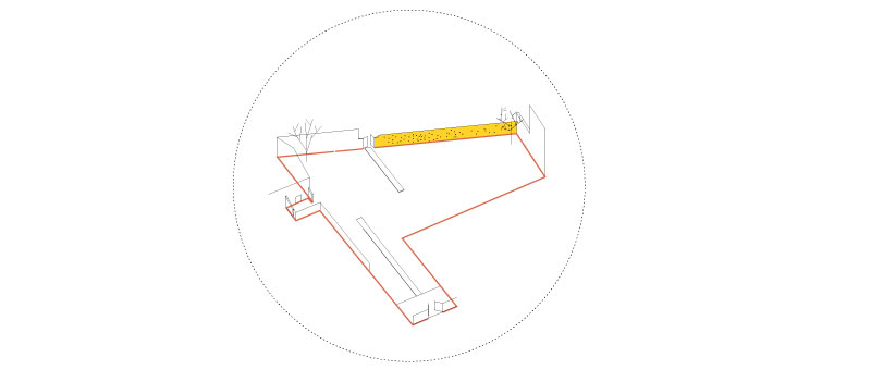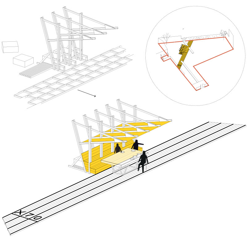 La structure est placée de façon à relier les deux allées en béton existantes et donc les deux entrées du site. Elle crée en plus un appel depuis la rue. L’abri est composé de cinq portiques en bois, lestés par les plots en bétons présents sur le site à l’origine. La toiture est recouverte d’une bâche étanche tendue entre les portiques.