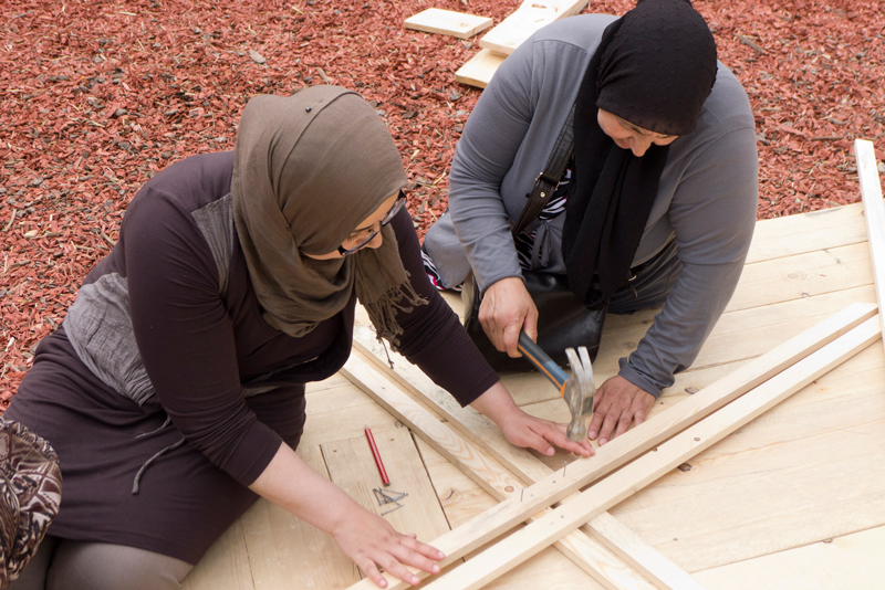 Afin que cet espace devienne agréable et vivant, nous avons questionné l’imaginaire de tous afin de trouver des solutions pour compléter la vie autour du jardin. Nous avons donc proposé de tester différents usages de ce lieux, en construisant un seul socle en bois qui s’est vu transformé chaque jour pour intégrer de nouvelles fonctions : un jour c’était barbecue, un autre, cinéma, balançoire, escalade, piscine, football, basketball, etc . A chaque nouvelle installation, les gens étaient invités à la construire avec nous, puis à organiser des mises en scènes dont les photos ont permis de valoriser tous ces usages et d’en discuter. Ci dessous, est disponible un livret qui dresse un bilan de ces expérimentations et qui a été distribué aux habitants.