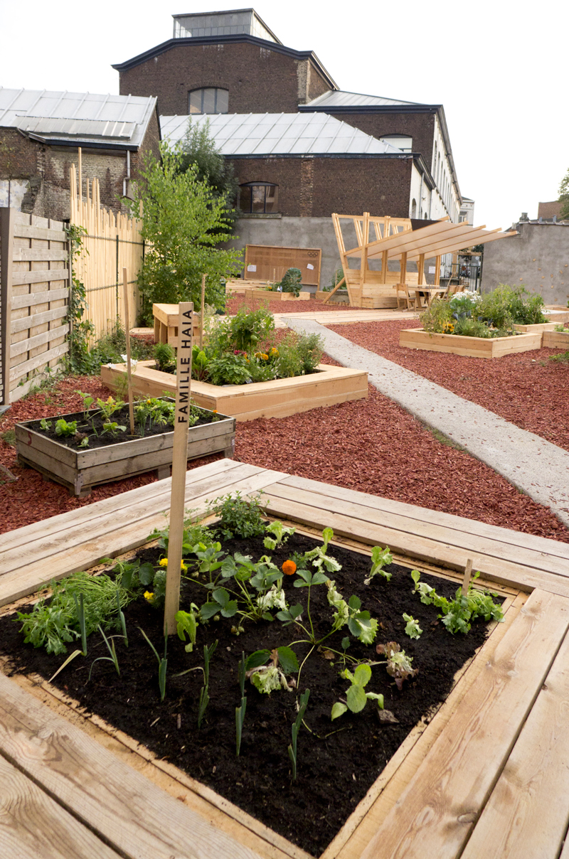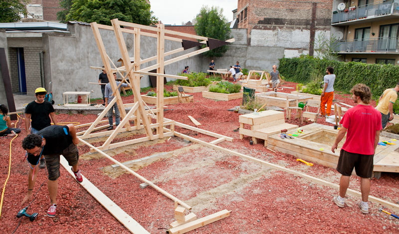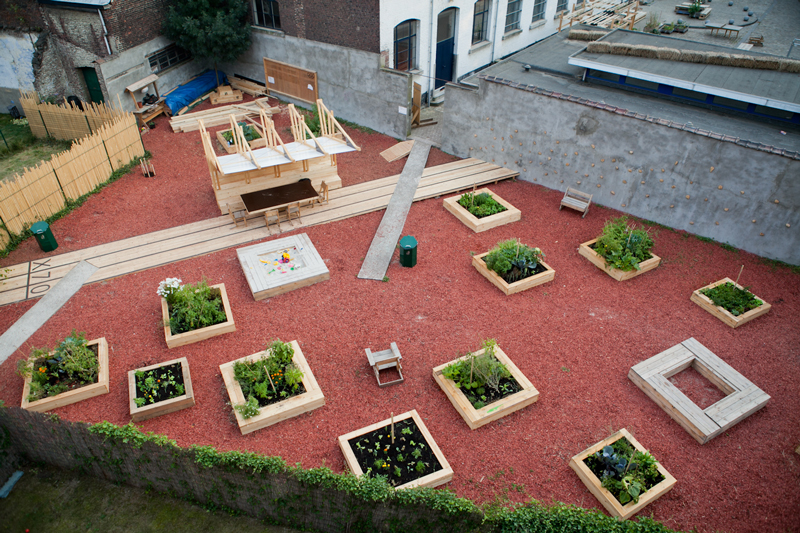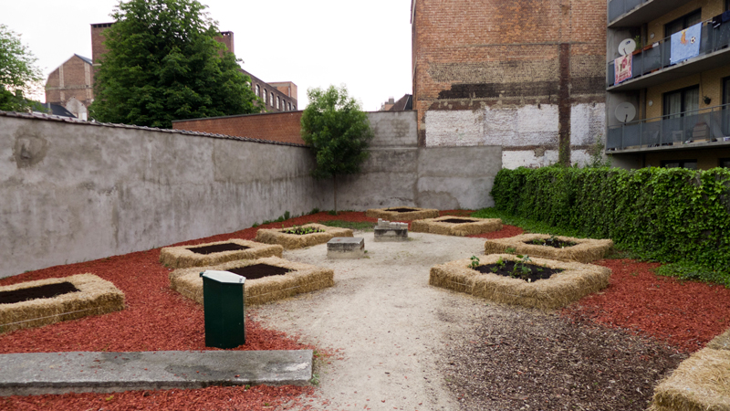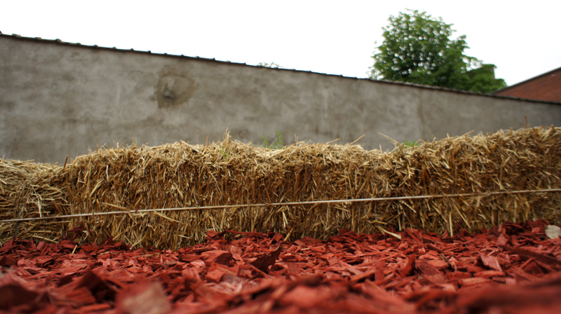 Ce premier aménagement était radical afin de transporter les gens dans un autre univers, cependant il restait sommaire et éphémère pour garder la possibilité de le modifier ultérieurement. Après un temps de nettoyage et désherbage du terrain, nous avons recouvert le sol d’un tapis de copeaux de bois teintés en rouge, récupérés dans les stocks de la ville de Bruxelles. Des bacs à planter ont été réalisés à l’aide de bottes de paille, puis remplis de terre et semés.