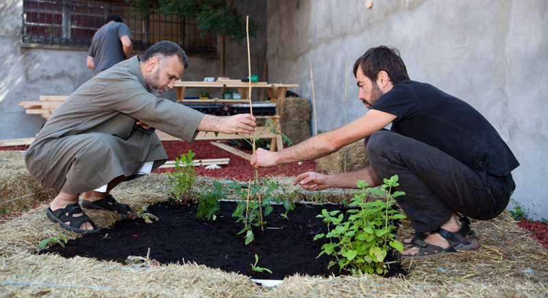 Si le projet s’est réalisé de manière collective entre les 3 partenaires, chacun avait néanmoins des rôles et compétences distincts : Tiphaine Hameau, jardinier-paysagiste, était principalement impliqué dans le premier aménagement du jardin potager et dans l’accompagnement des habitants pour le jardinage. Julie Guiches et Benoit Lorent géraient la coordination avec tous les acteurs locaux : Cürohall, l’I.B.G.E (Institut Bruxellois pour la gestion de l’environnement ), les services de la ville de Bruxelles et les usagers du jardin. Ils ont fait le lien sur le terrain entre les 3 phases. Julie et Benoit ont par ailleurs réalisé la plupart des photos affichées ci-dessous. Le Collectif Etc et Mattia Paco Rizzi ont concentré leurs efforts sur la réalisation des aménagements et sur l’animation des temps fort.
