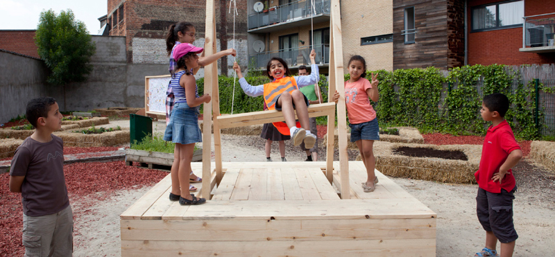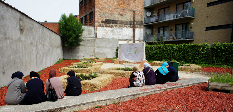 L’objectif était de faire un espace partagé qui serait co-géré par la ville de Bruxelles et par un collectif d’usagers identifié mais qui resterait ouvert au public. Il était évident que la condition de réussite du projet serait avant tout l’implication des habitants des 2 immeubles. Non seulement il s’agissait de motiver ces gens à utiliser et à prendre en main cet espace de manière collective mais il s’agissait aussi de permettre à d’autres gens du quartier de venir en profiter. C’était un double travail de pédagogie auprès des habitants qui a débuté dès la première phase.