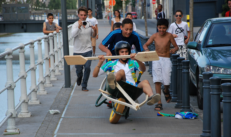 L’épreuve du push-kayak eut lieu sur les quais du canal. Le canal a été creusé à l’origine dans un intérêt fonctionnel et sanitaire pour répondre en particulier aux besoins des abattoirs florissants d’Anderlecht. N’ayant plus les mêmes fonctions, le quartier tourne à présent le dos à ce dernier et les piétons ne sont pas à l’aise sur ses berges. L’intérêt de l’épreuve du mercredi était de donner une autre vision de ce canal et de questionner ses abords. Le push-kayak est une discipline hybride combinant le pushcar et le kayak : Le bolide est composé de tasseaux en bois galbés sur mesure et fixés sur une brouette. Le temps de l’épreuve, les sportifs ont transformé le trottoir caché par les voitures, en un terrain d’aventure au dessus du canal.