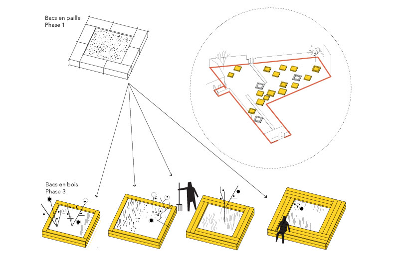 L’utilisation de la paille a permis d’aménager le site très rapidement en phase 1. Cependant ce matériaux était temporaire pour des bacs à jardiner et il était nécessaire de le remplacer par une structure en bois. L’opération s’est effectuée sans déraciner les plantes déjà mûres et la trame s’est densifiée pour créer des bacs supplémentaires à la demande des habitants.