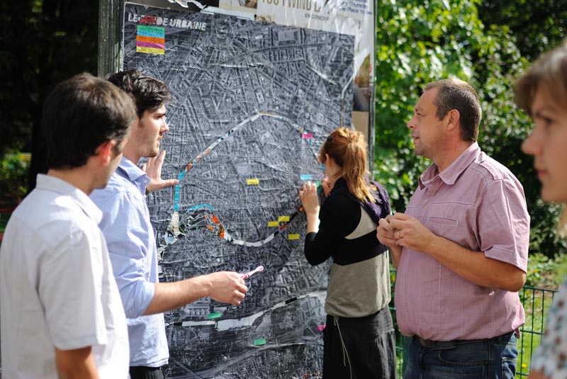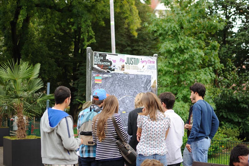 Une simple photo aérienne de Strasbourg. Nous invitons les passants à s’approcher, à se repérer, et à se rappeler une expérience qu’ils ont eu à Strasbourg. Ils l’écrivent sur une languette de couleur et la collent. En vert pour une anecdote anecdote, en bleu pour une rencontre, en orange pour l’art urbain, en rose pour un amour sauvage, et en jaune pour le bon plan.