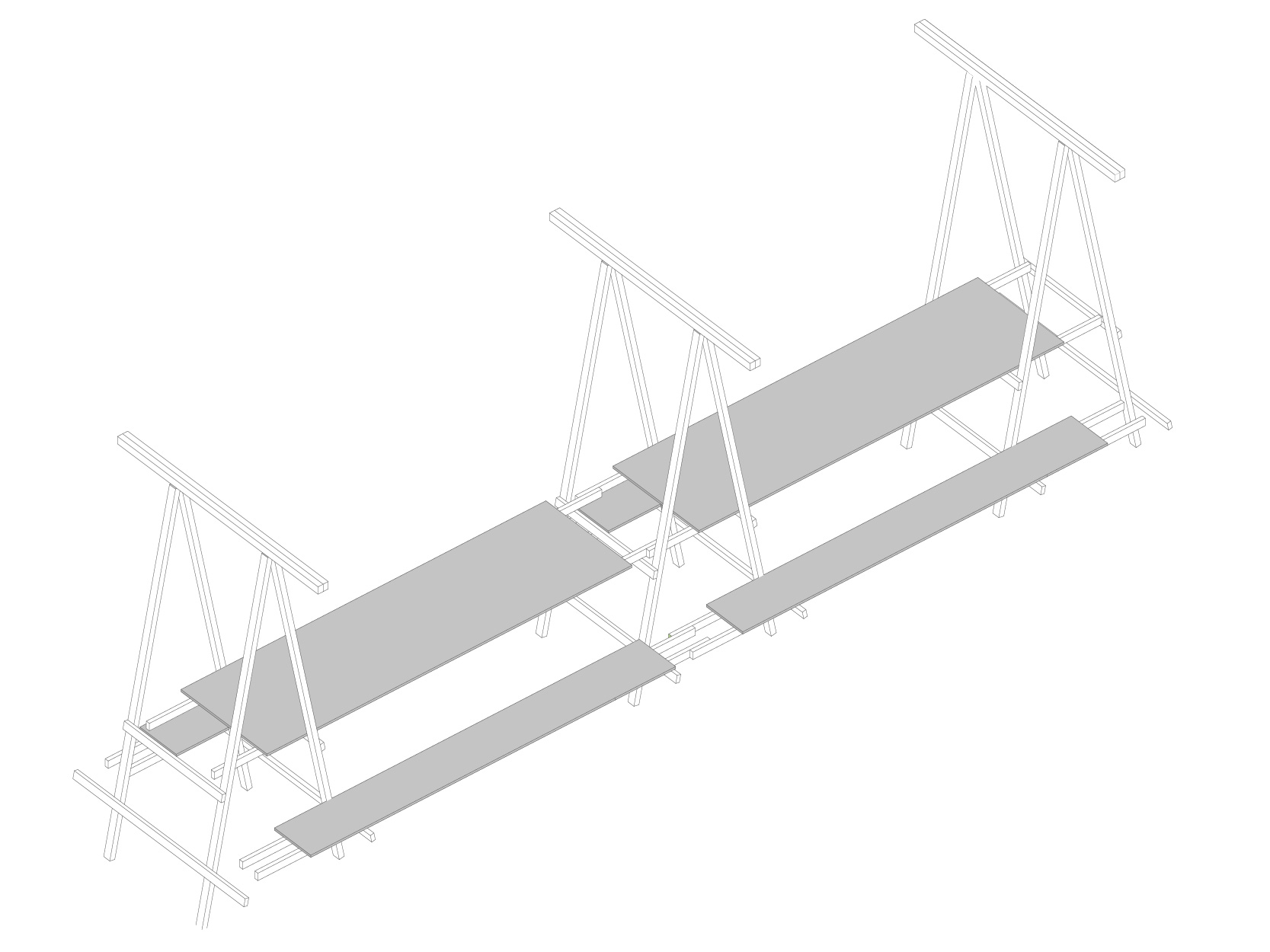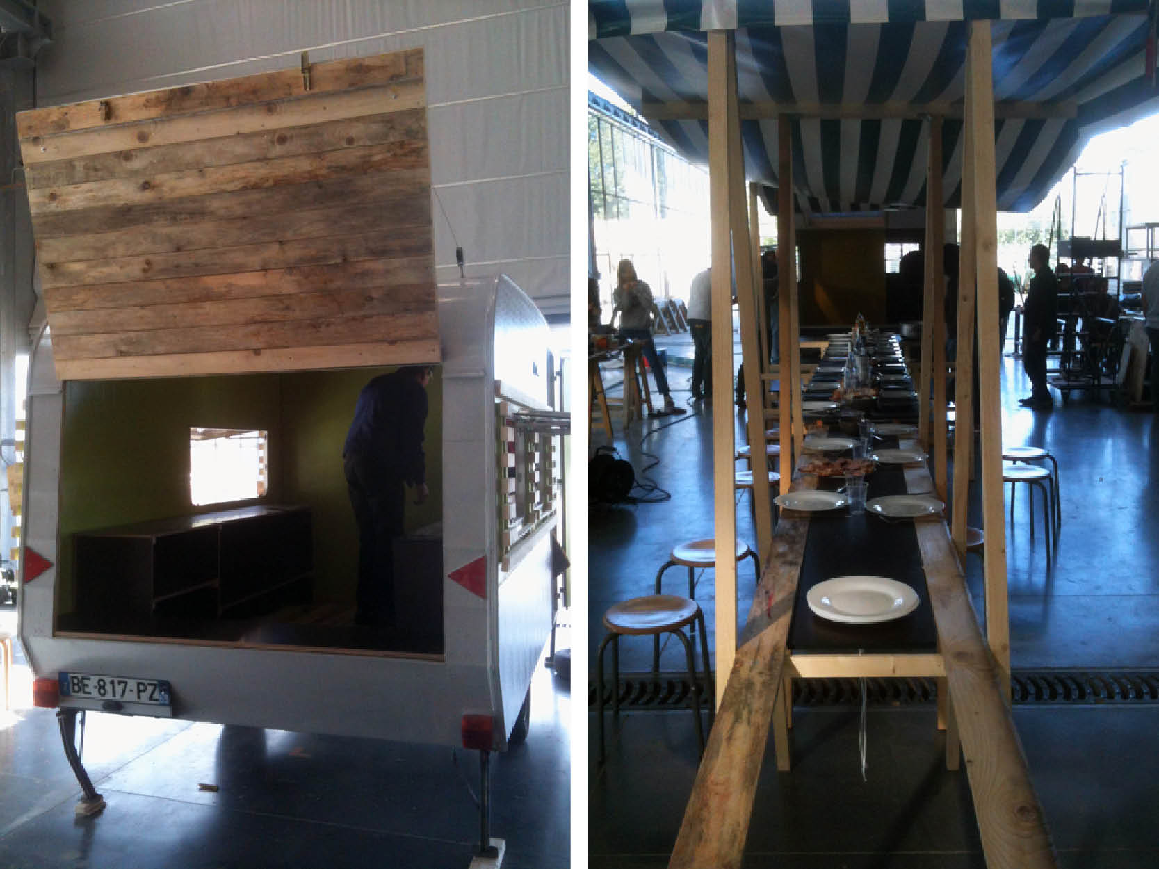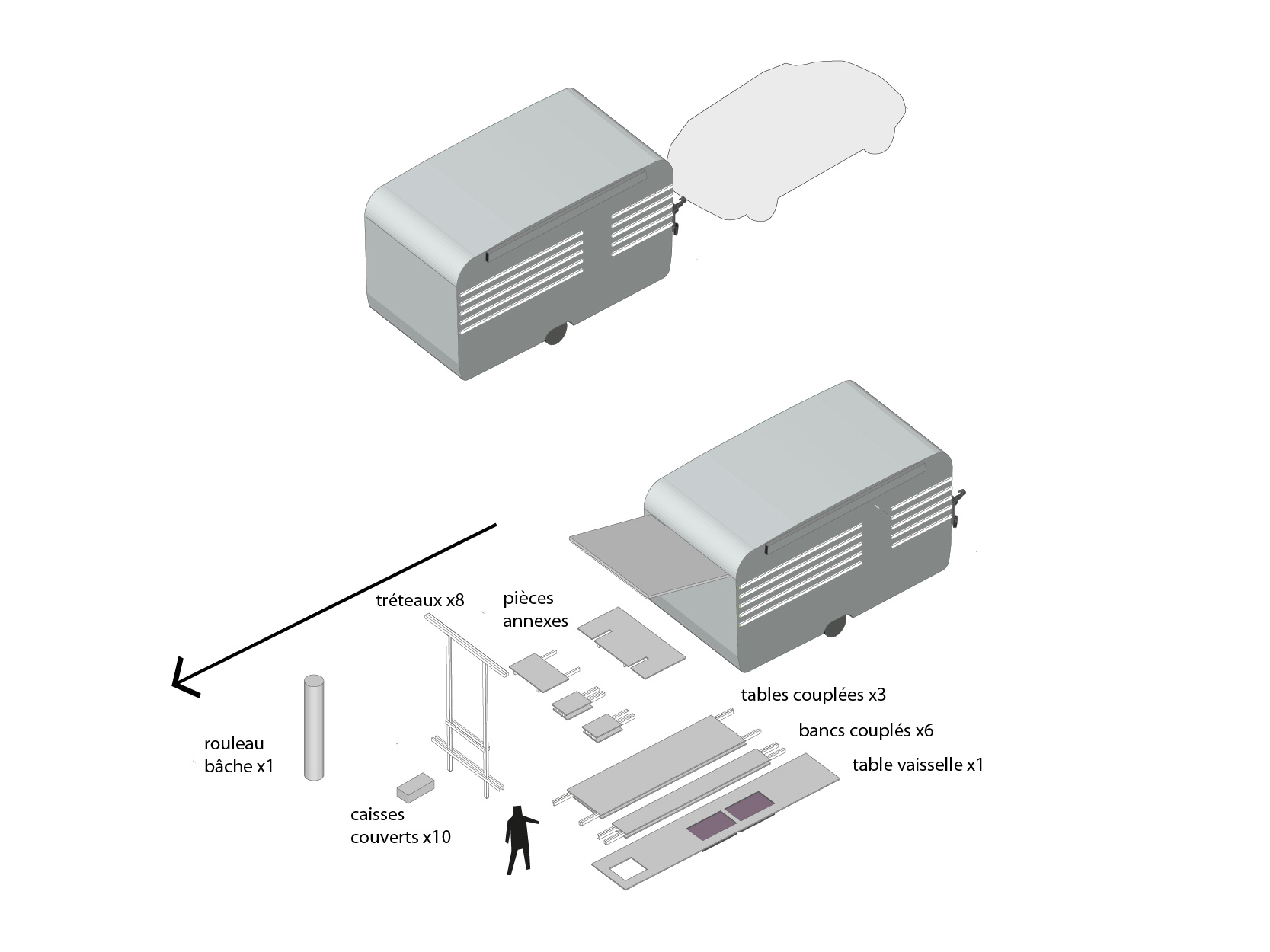 Les tables et les bancs sont pensés selon un module, qui vient prendre place à l’arrière de la caravane. Les tables et bancs reposent sur de grands tréteaux pliants, et s’emboîtent grâce à des tasseaux en bois qui les empêchent de basculer. En fonction du nombre de personnes présentes pour les repas, il est facilement possible d’ajouter ou de supprimer un module.