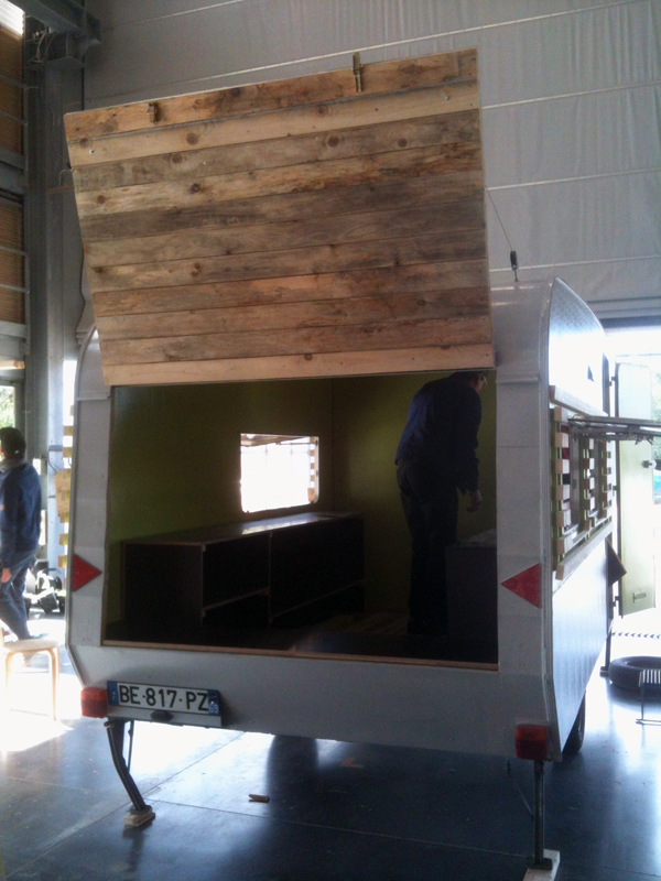 Le coffre est maintenu ouvert grâce à un système de poulies et de câbles métalliques tirés jusqu’à l’avant de la caravane. L’intérieur est repeint et deux meubles de rangement sont disposés sur les cotés. Un nouveau plancher est crée avec de la volige. Il se continue sur le hayon.