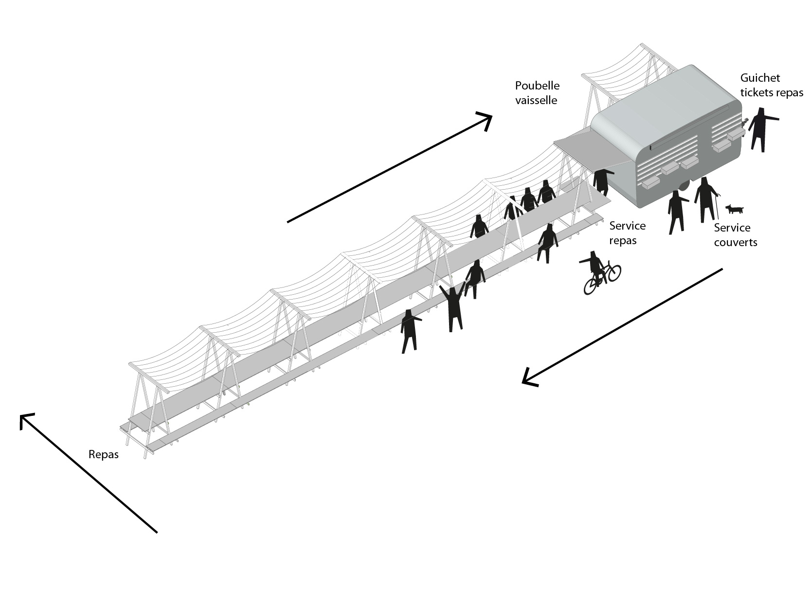 La caravane devient l’élément central du dispositif. Un guichet est mis en place à l’intérieur, permettant à une personne de l’association de distribuer des tickets repas. Ensuite, les personnes font la queue, en découvrant les produits culinaires exposés, et prennent leurs assiettes et couverts dans des paniers suspendus. Le chef cuisinier prend place en bout de table, et distribue les repas. L’ouverture arrière lui permet de gérer aisément ses stocks de nourriture laissés à l’intérieur. Les personnes servies vont ensuite s’installer pour créer un grand banquet. Environ trente personnes peuvent prendre place sur cette grande table. Une fois leurs assiettes terminées, les personnes se dirigent vers le pôle vaisselle, afin de laver leurs ustensiles.