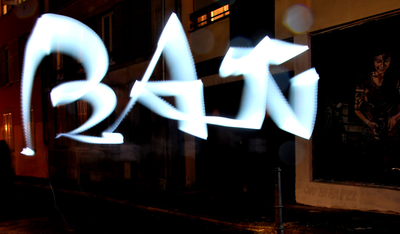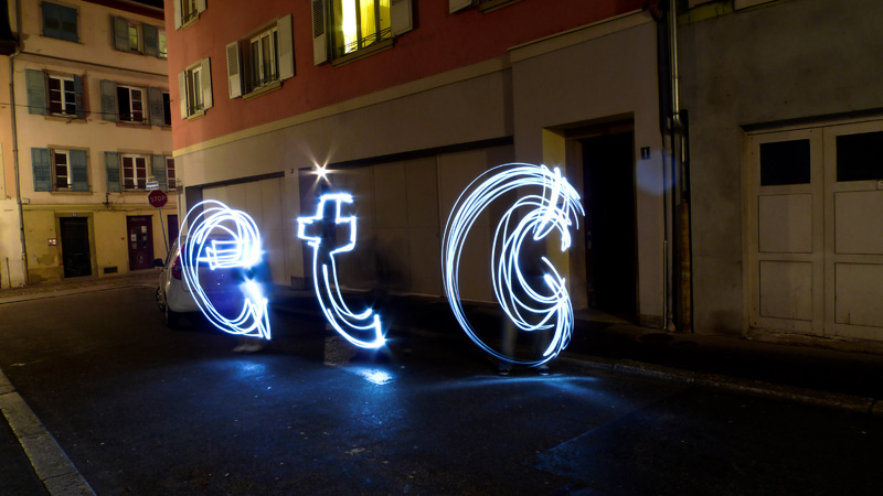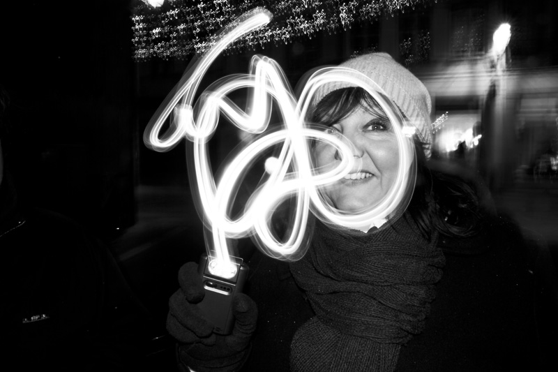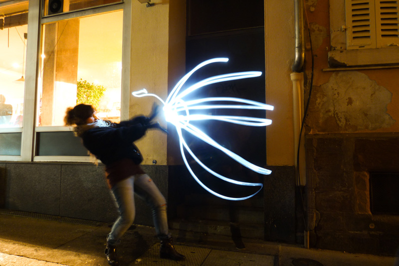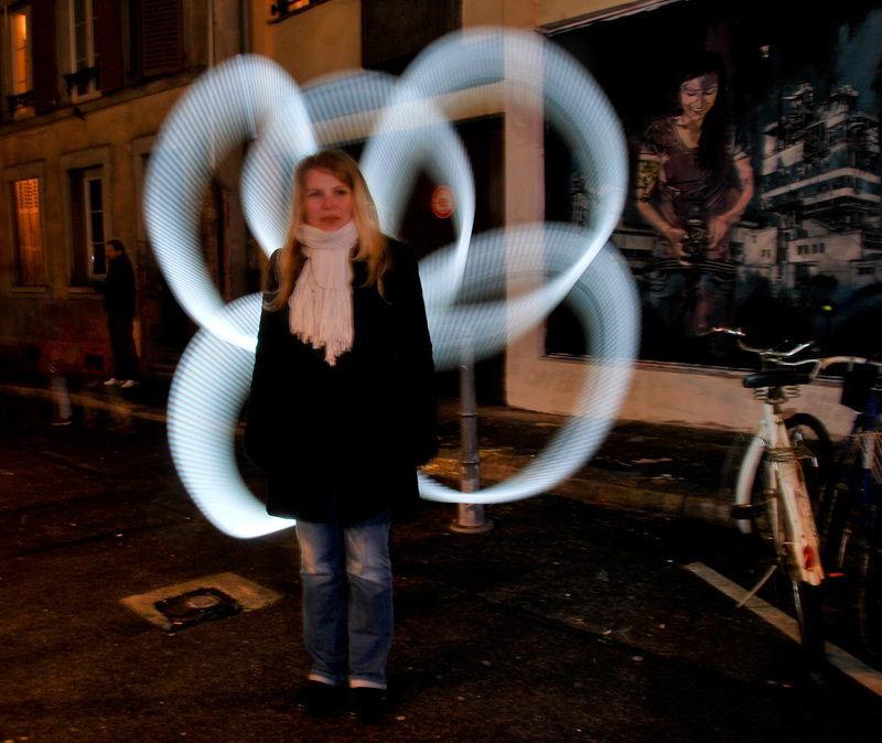 En face de la réalisation des artistes Jana et JS sur le mur, la soirée d’expérimentation autour du light painting anime l’ensemble de la rue normalement délaissée par l’activité effervescente du marché de Noel à proximité.