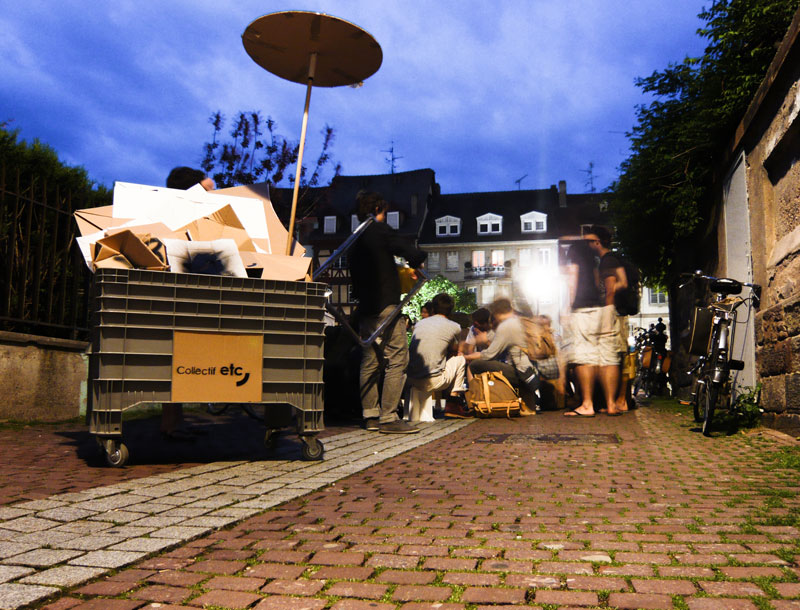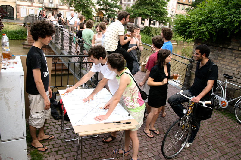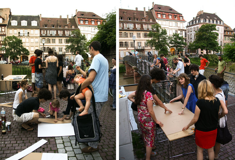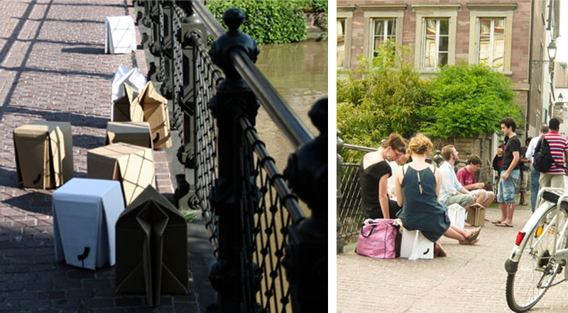 Des ateliers de pliages et d’échanges donnent forme à une terrasse spontanée. Les simples planches de carton deviennent en quelques tours d’origami de petits tabourets aux formes variées. Un prétexte pour permettre aux passants, l’espace de quelques instants, de faire de la Passerelle de l’Abreuvoir leur salon de thé. Un lieu de mouvements pour s’arrêter, observer, écouter, partager. Une occupation collective, ludique et partagée, pour une vision optimiste de la ville.