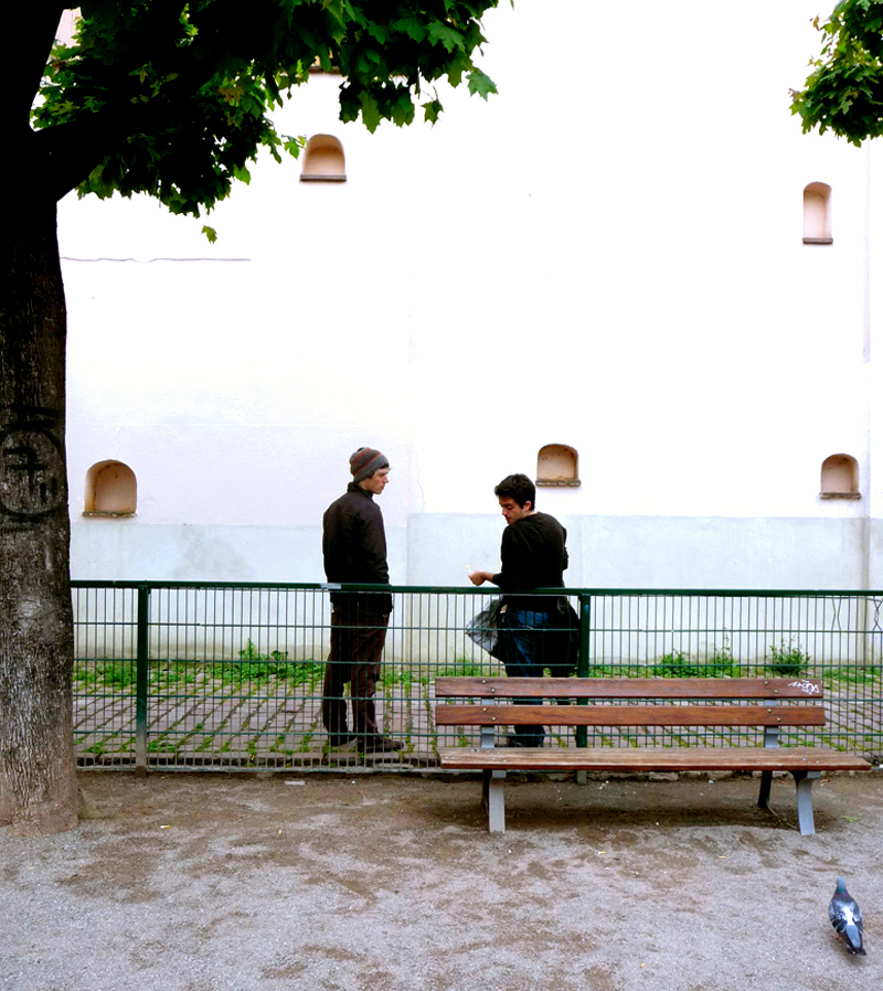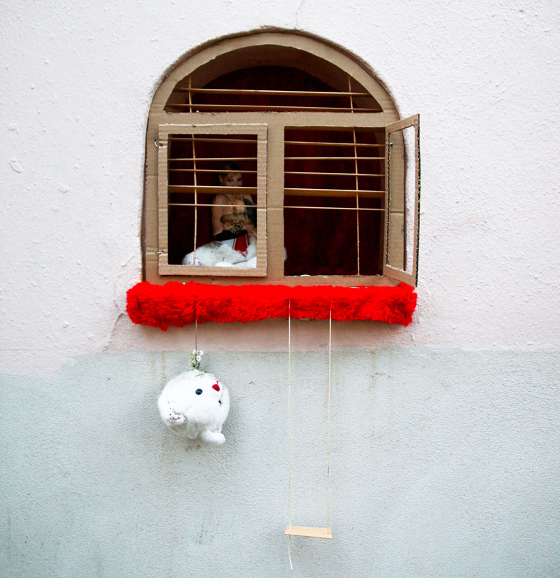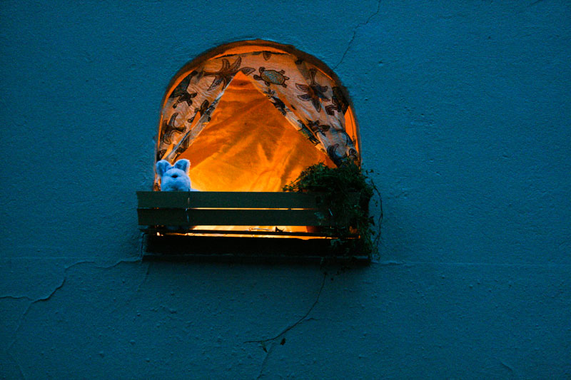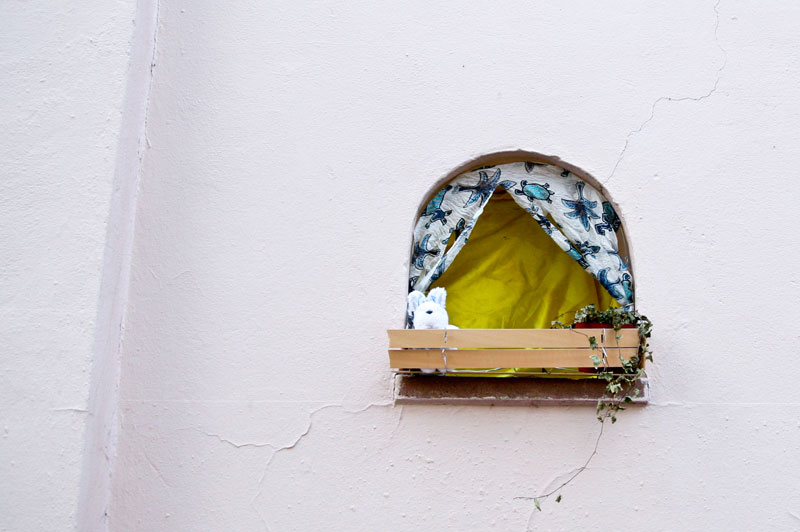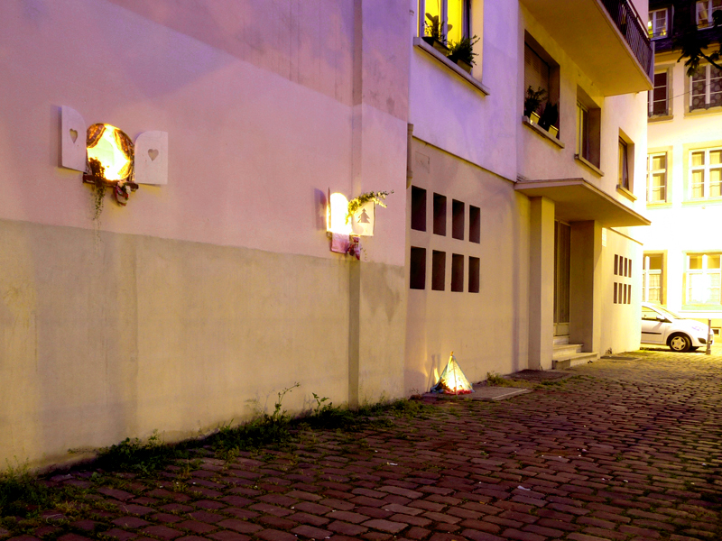 Place Mathias Merian. Un square près de la cathédrale. Face aux jeux pour enfants se dresse un mur aveugle dont l’austérité est chahutée par quelques alcôves discrètes. De nouveaux locataires y prennent place. L’un après l’autre, l’un avec l’autre. Ici on vient étendre son linge, là-bas on arrose ses plantes. Et le soir venu, ici comme chez les autres locataires de la place, une lumière apparait à la fenêtre.
