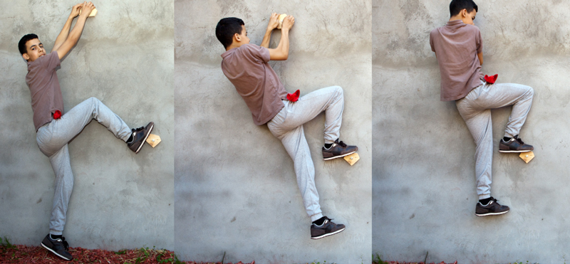Sur la base des expérimentations de la phase 2, tout le mur du fond a été transformé en terrain d’escalade. Des prises en bois ont été découpées, poncées, puis fixées au mur.