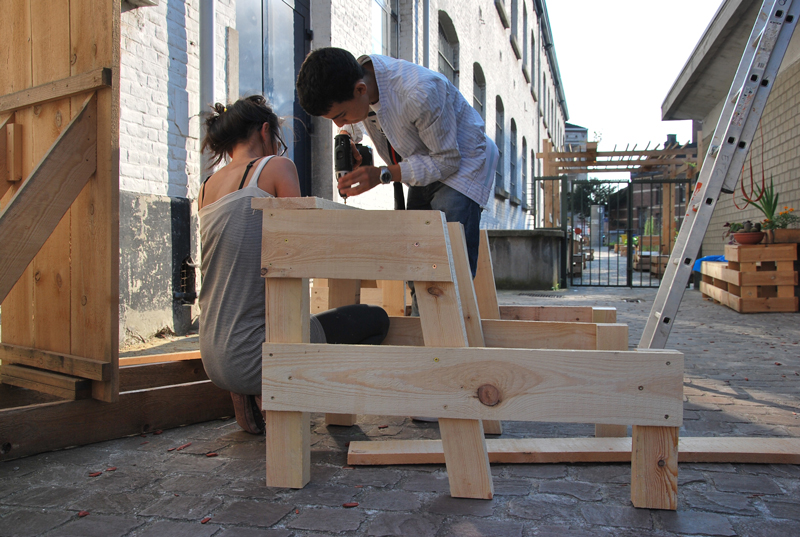 Le cadre de Parckdesign 2012 nous a amené à travailler dans un lieu qui avait été proposé par la ville. Une fois que notre projet s’est trouvé sélectionné, nous sommes allé sur le terrain et avons rencontré des habitants qui ne savaient pas encore ce qui allait se passer en bas de chez eux, dans ce qu’ils considéraient comme leur « terrain vague » privé. Cependant, ils étaient la clef nécessaire à la réussite du projet. Pour cela, il a fallu réunir ces nouveaux voisins, leur expliquer le projet, leur accorder du temps, les inviter à participer, à s’impliquer. Combien de rendez-vous ? Combien de coups de gueule ? Combien de journées de permanence pour OST, les seuls bruxellois de notre équipe ? Combien de fois on a cru que la porte du jardin se refermait pour de bon ? Nous avons organisé de nombreux temps de parole et nous avons pu construire une relation de confiance avec les voisins qui prenaient progressivement conscience de l’intérêt d’un tel jardin.