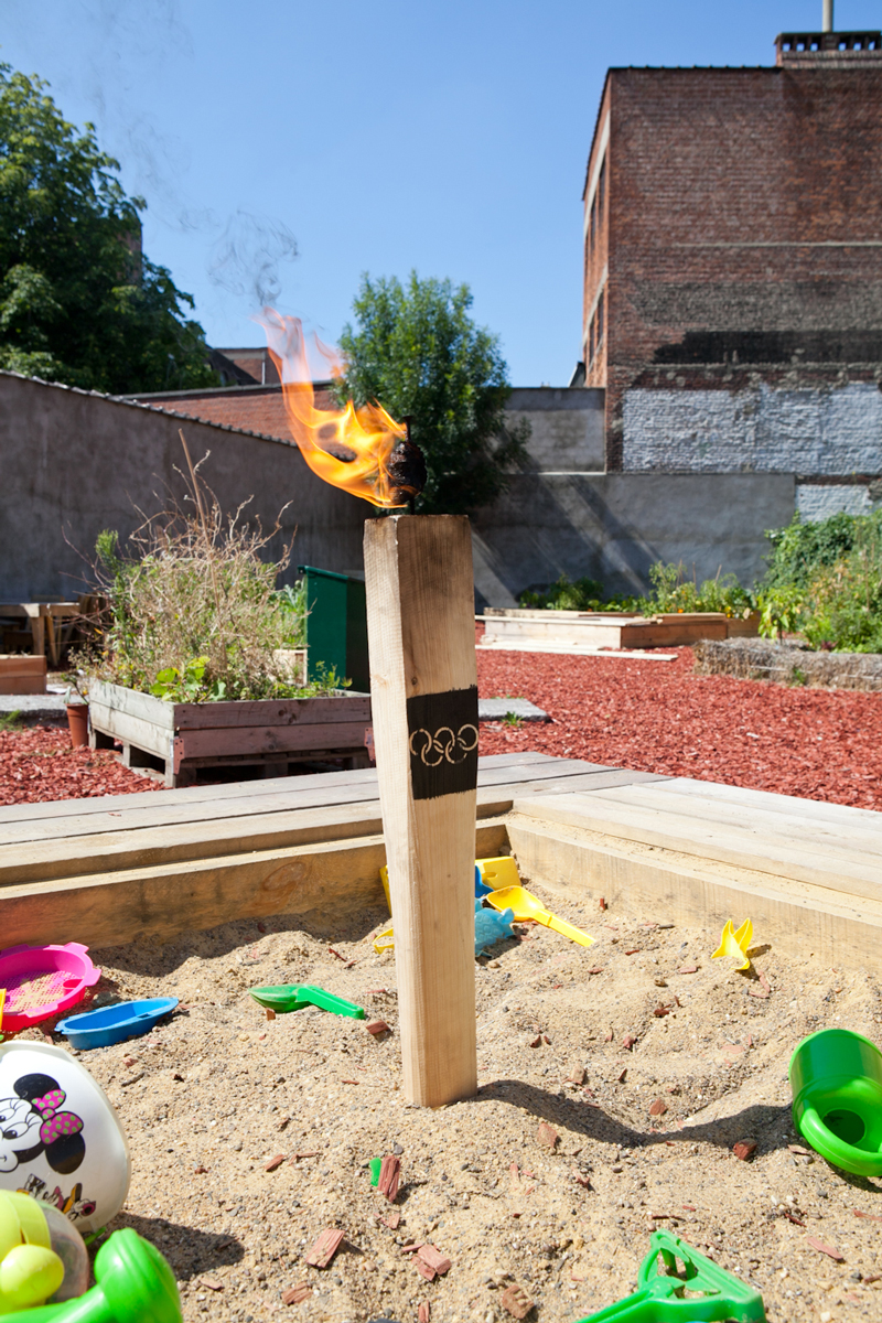 Le dimanche 12 août nous avons commencé par la cérémonie d’ouverture des jeux Olympiques. C’était une parade dans le quartier durant laquelle nous avons défilé avec les enfants en brandissant la flamme olympique tout le long du parcours des épreuves sportives imminentes. Plusieurs éléments de mise en scène avaient été fabriqués pour l’occasion : un drapeau du village olympique, une enceinte et un ampli sur roues, un tableau des scores, un micro pour le journal télévisé et des tenues de sportifs. Des flyers avec un programme de la semaine étaient distribués. Le but était de communiquer sur l’existence de ce jardin et d’inviter les gens du quartier à venir participer aux jeux olympiques