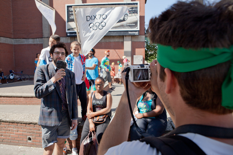 Pour cette dernière phase nous avons mis en scène un évènement pendant 1 semaine : les Jeux Olympiques d’Anderlecht. Le principe était de mobiliser les gens du quartier dans l’aménagement du jardin et la valorisation d’espaces publics alentours, par le biais d’animations sportives quotidiennes. Le quartier a été transformé en village olympique pendant deux semaines : Le jardin, c’était le stade dans lequel la remise des médailles avait lieu après chaque épreuve. Les jeunes courges et potirons ont vus se dresser devant eux tribunes olympiques et piste d’athlétisme. Sur un rayon de 500 m autour du Stade/Jardin, cinq lieux dans le quartier ont successivement accueilli une épreuve sportive par jour. Ont participé à ces épreuves les enfants, des passants et des associations de quartier. Nous avions choisi ces endroits pour leurs intérêts urbains et comme pour le stade, nous y avons installé du mobilier urbain déguisé en équipements sportifs. Un journal télévisé quotidien retranscrivais le déroulement des épreuves et un site internet spécifique a été créer pour communiquer sur l’évènement : http://anderlecht2012.tumblr.com/