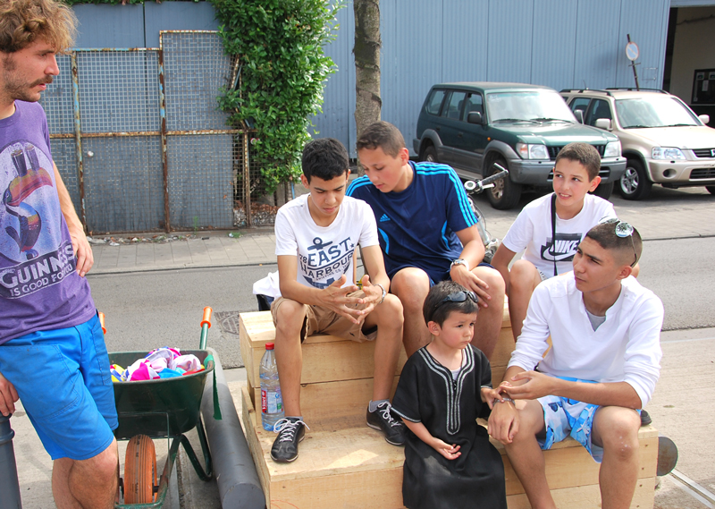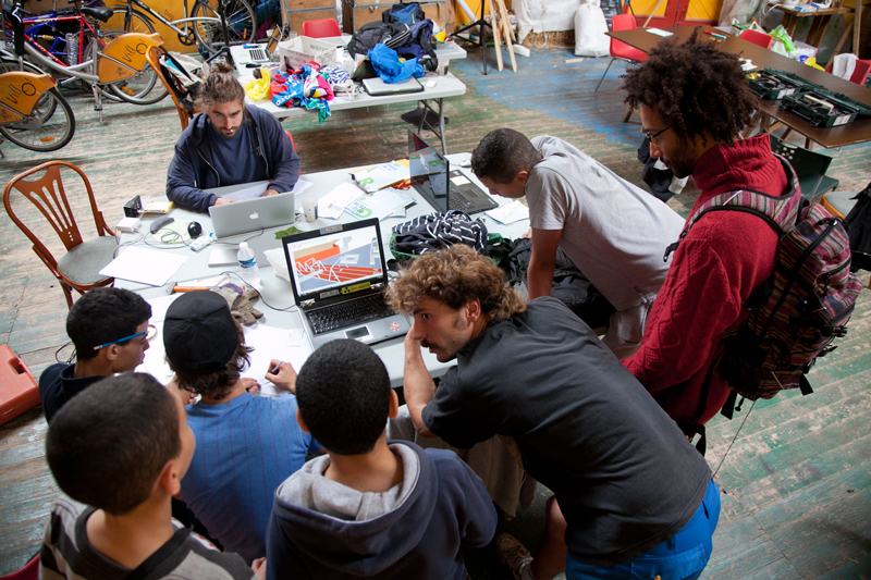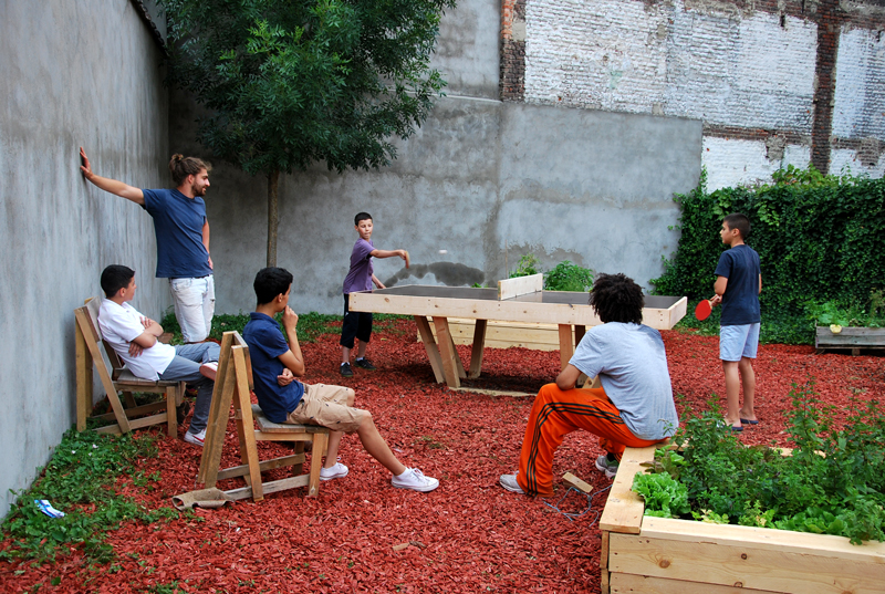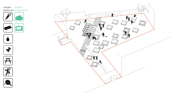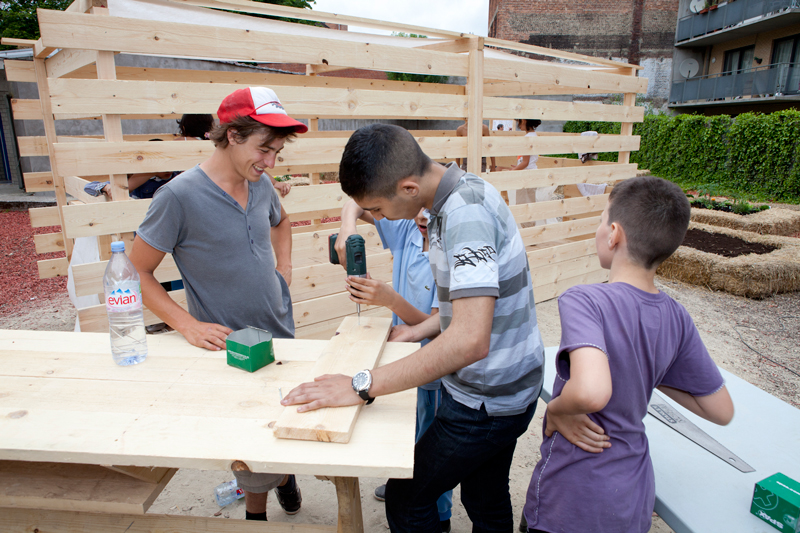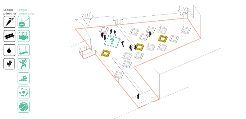 Afin que cet espace devienne agréable et vivant, nous avons questionné l’imaginaire de tous afin de trouver des solutions pour compléter la vie autour du jardin. Nous avons donc proposé de tester différents usages de ce lieux, en construisant un seul socle en bois qui s’est vu transformé chaque jour pour intégrer de nouvelles fonctions : un jour c’était barbecue, un autre, cinéma, balançoire, escalade, piscine, football, basketball, etc . A chaque nouvelle installation, les gens étaient invités à la construire avec nous, puis à organiser des mises en scènes dont les photos ont permis de valoriser tous ces usages et d’en discuter. Ci dessous, est disponible un livret qui dresse un bilan de ces expérimentations et qui a été distribué aux habitants.