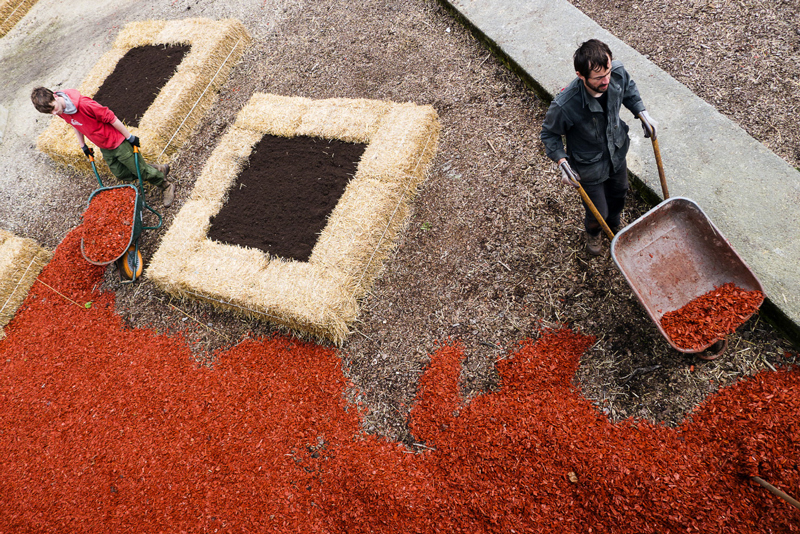 Ce premier aménagement était radical afin de transporter les gens dans un autre univers, cependant il restait sommaire et éphémère pour garder la possibilité de le modifier ultérieurement. Après un temps de nettoyage et désherbage du terrain, nous avons recouvert le sol d’un tapis de copeaux de bois teintés en rouge, récupérés dans les stocks de la ville de Bruxelles. Des bacs à planter ont été réalisés à l’aide de bottes de paille, puis remplis de terre et semés.