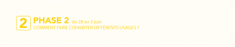 La deuxième phase avait pour but de provoquer du débat et de la discussion autour d’expérimentations de différents usages. Depuis la première phase, les gens ont commencé à s’organiser, des problèmes de cohabitation d’usages sont apparus… Les habitants jardiniers ont été suivis et d’autres bacs ont été attribuées mais comment peuvent cohabiter enfants, jardiniers et autres usagers du lieu ?