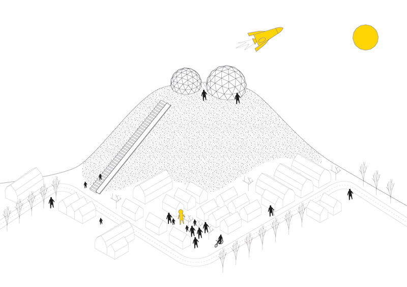 Ce terril offre un paysage lunaire très particulier surlequel Les Saprophytes s’étaient déjà appuyés pour leurs interventions précédentes. Pour prolonger cette démarche, ont été programmées cette fois-ci, deux installations aux temporalités différentes : les dômes géodésiques (éphémère) et la rampe de lancement (temporaire).